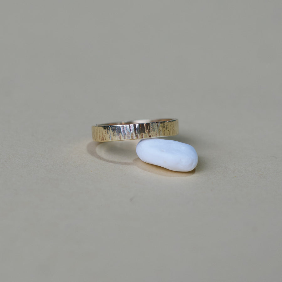 This flat band is made of recycled 14k gold and completely hand forged. It measures 4mm wide and 1mm thick with a unique subtle texture. This is a classic, genderless style.